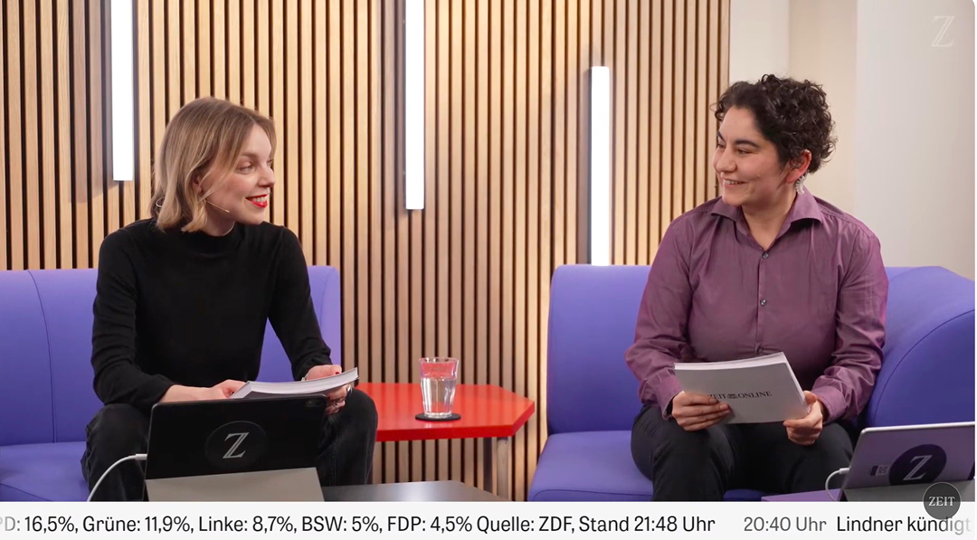 Wer schafft es in den Bundestag? Wer kann und will mit wem regieren? Im Livestream analysieren Azadê Peşmen und Ann-Kristin Tlusty die Bundestagswahl gemeinsam unter anderem mit dem Experten und Autor Özgür Özvatan, außenpolitische Koordinatorin Anna Sauerbrey (ZEIT) und Politikressortleiter Heinrich Wefing (ZEIT).